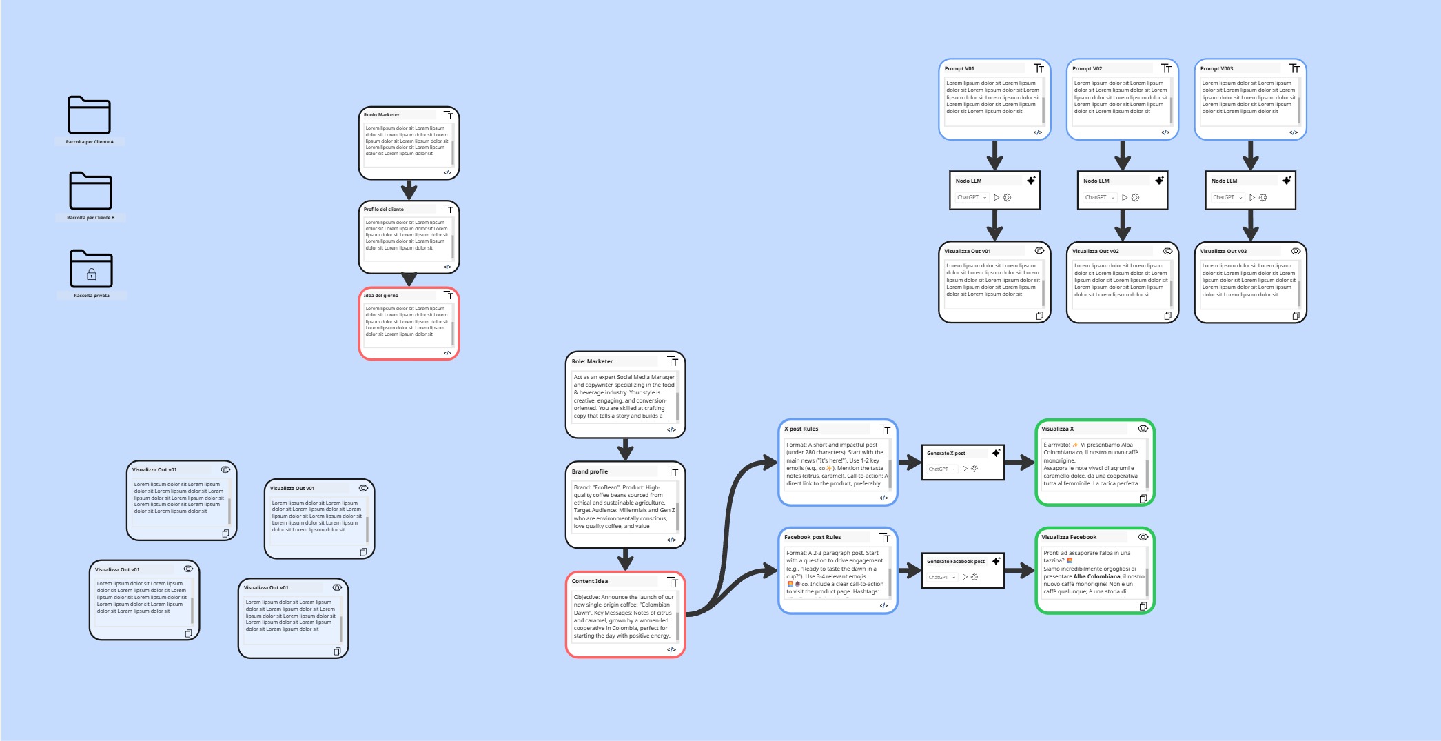 Vedi tutto il flusso a colpo d'occhio. Ogni nodo è un pezzo del tuo prompt, modificabile e testabile singolarmente.