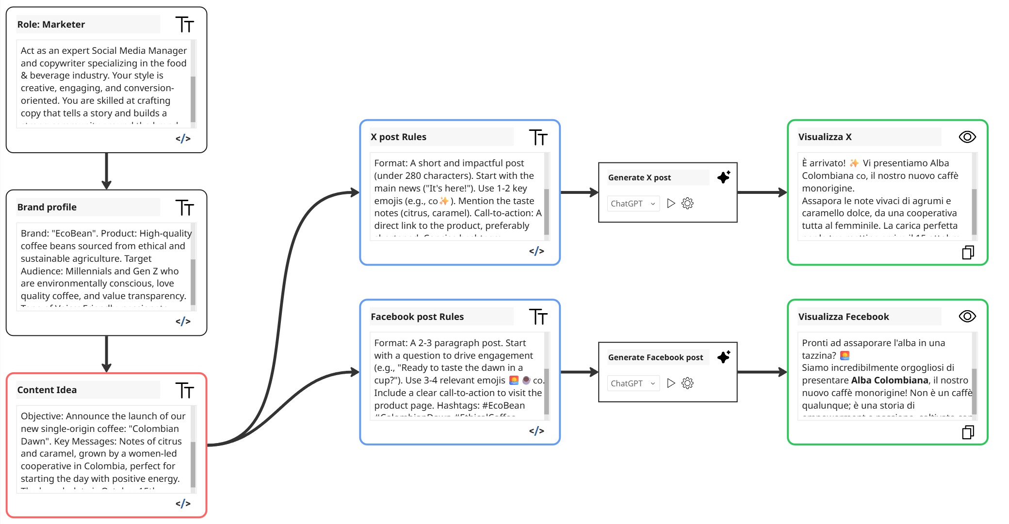 Trasforma prompt complessi in nodi connessi.